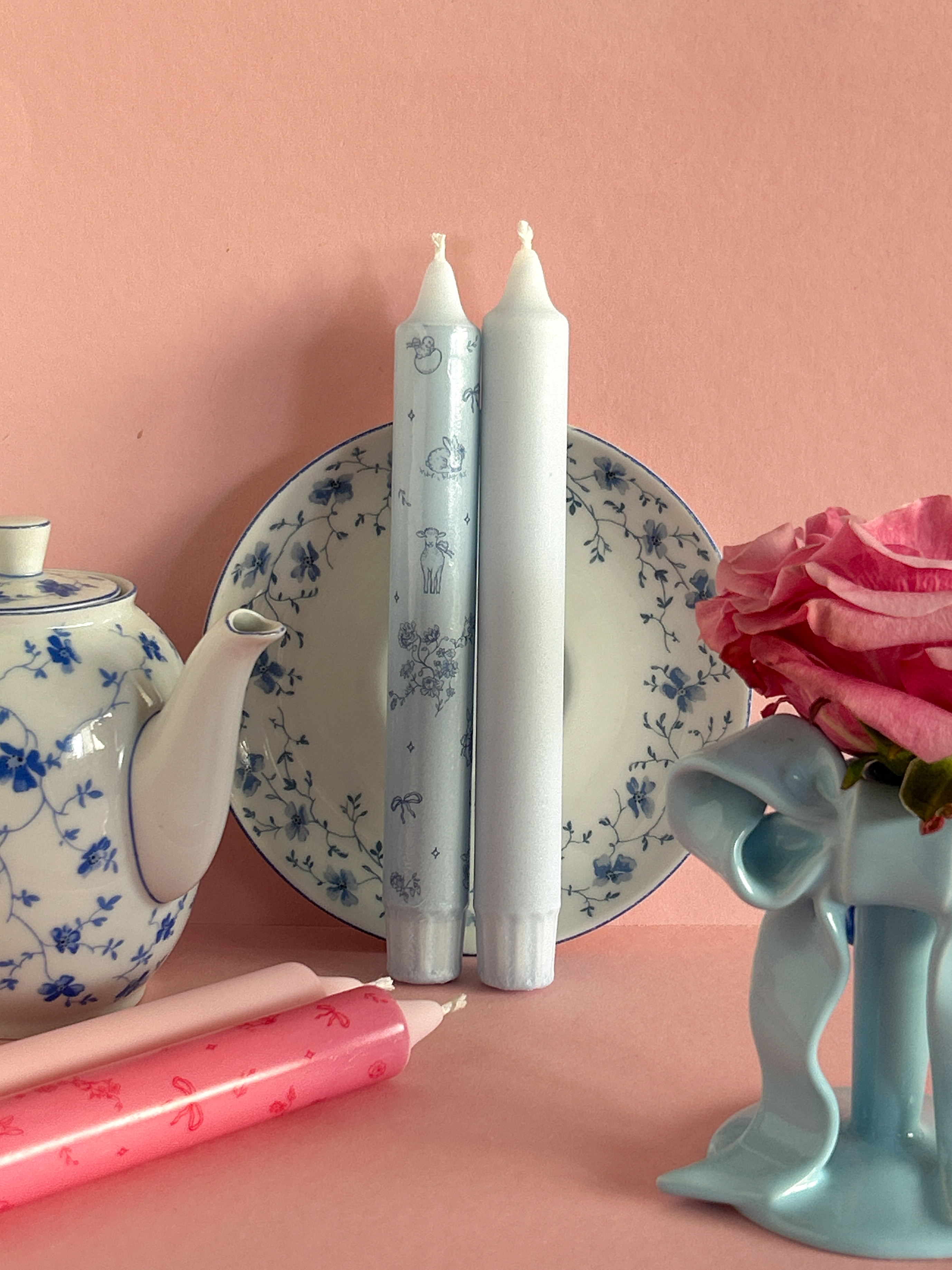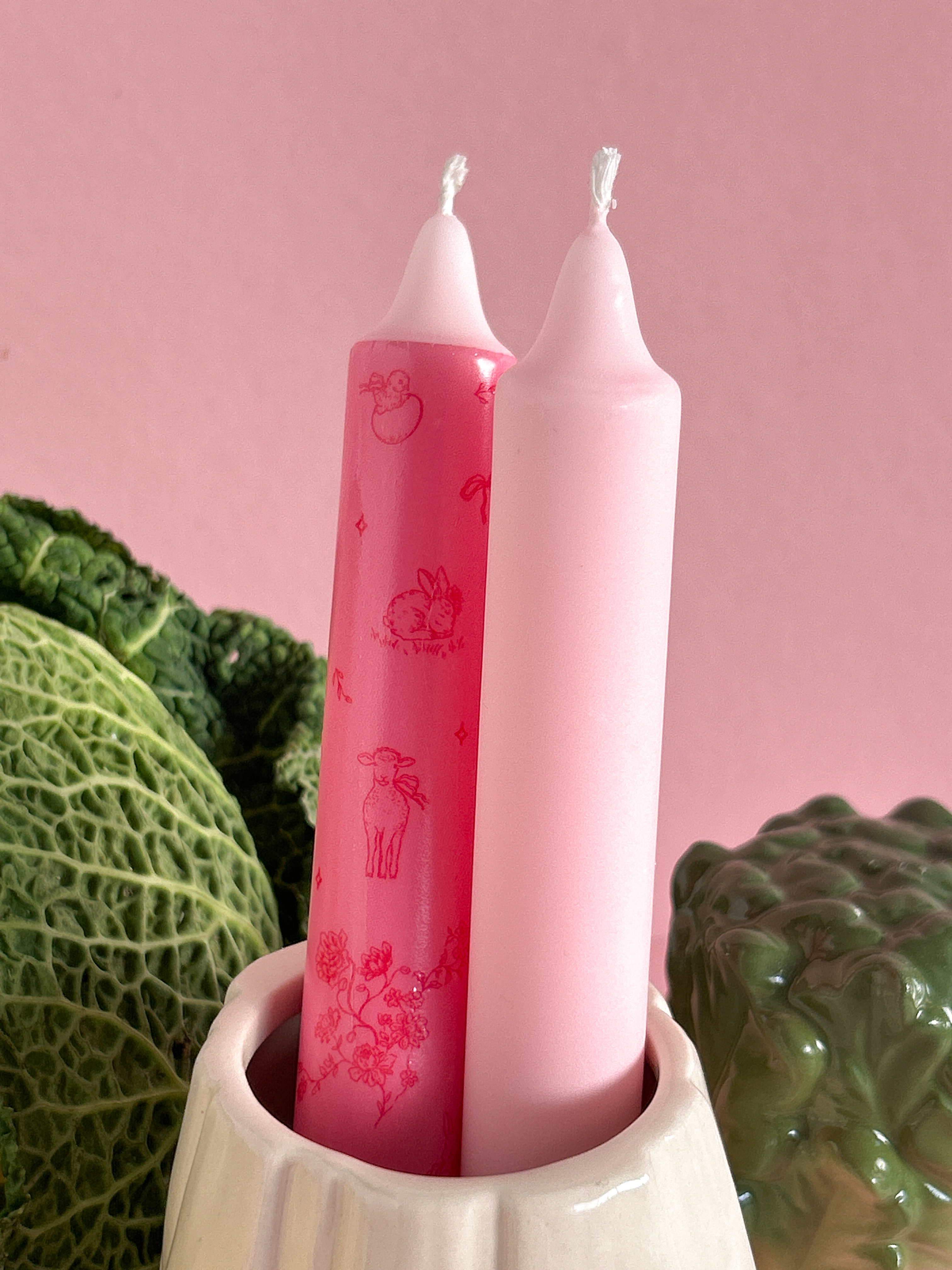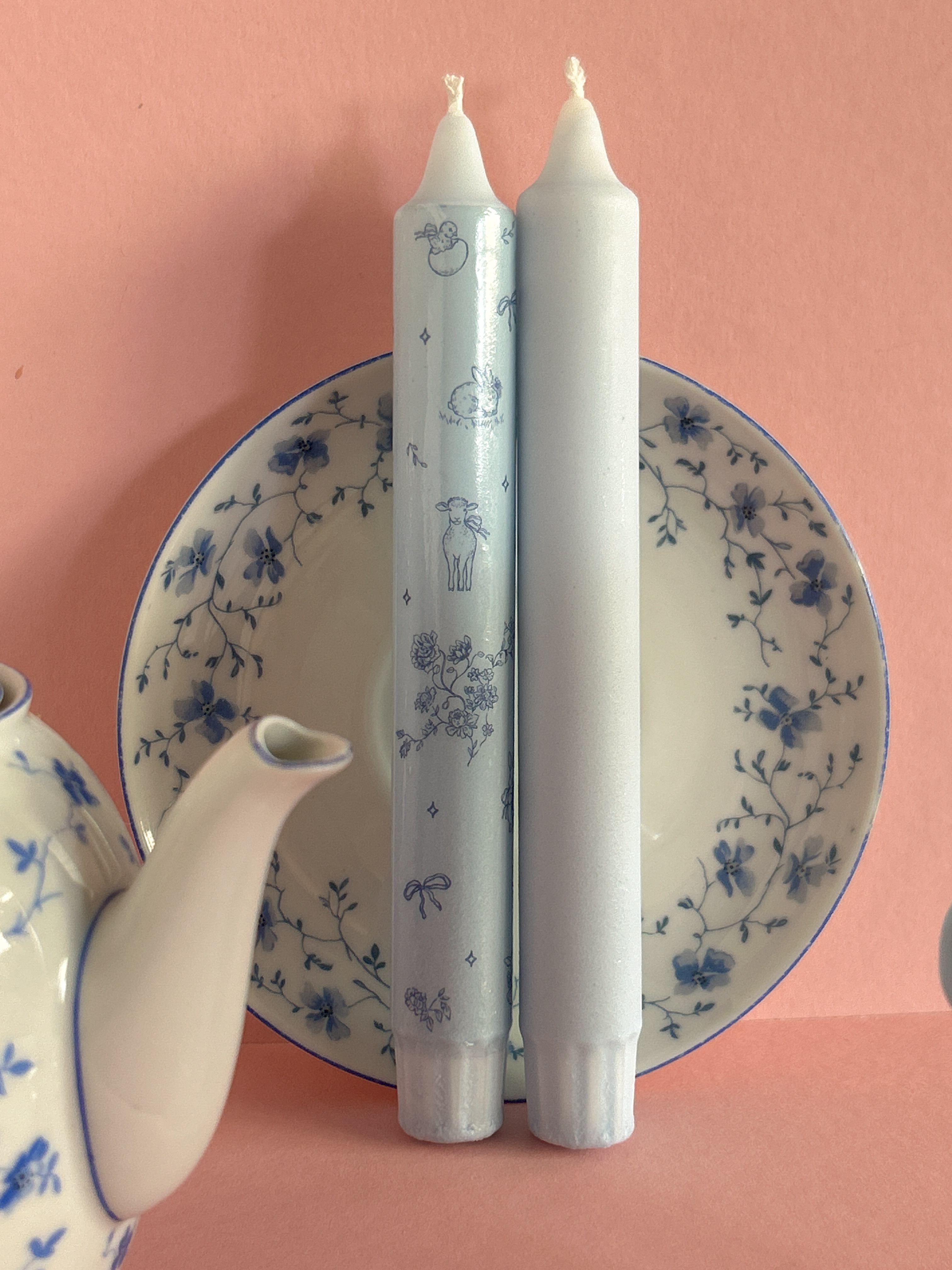 Стеариновые свечи окрашены вручную по специальной технологии. В наборе две свечи: одна с принтом, вторая монохромная цветная. Благодаря составу свечи долго горят и не «плачут».