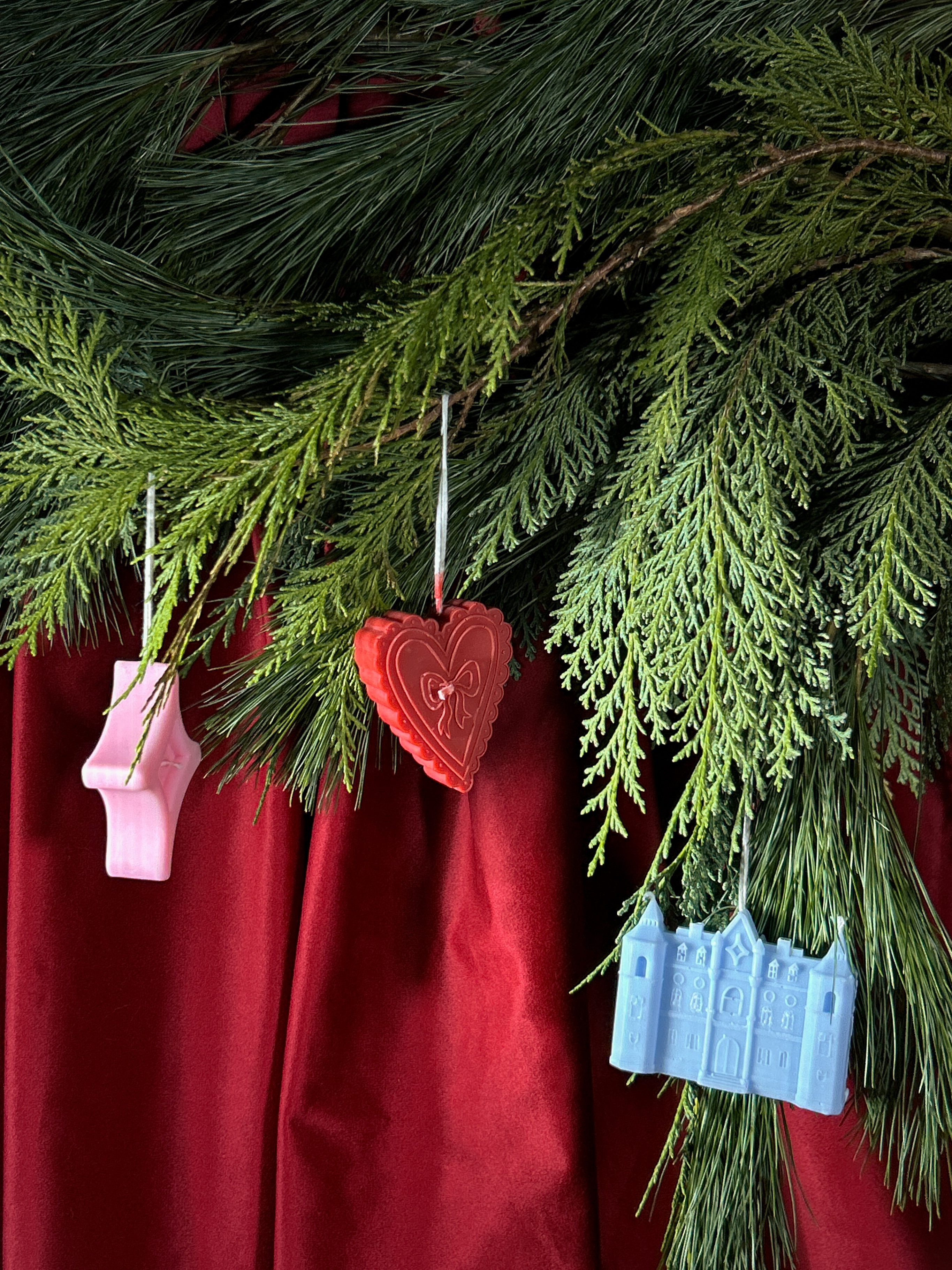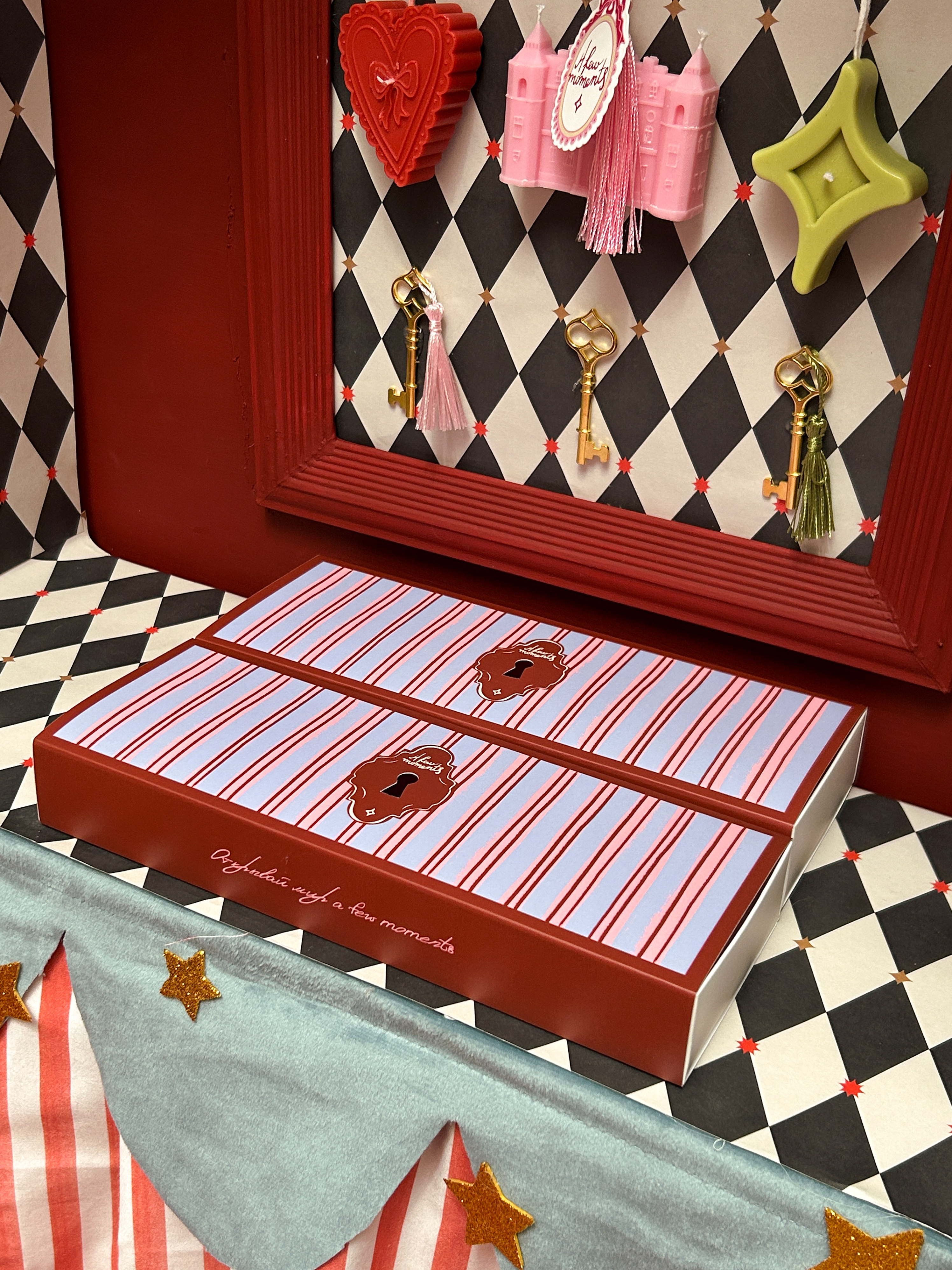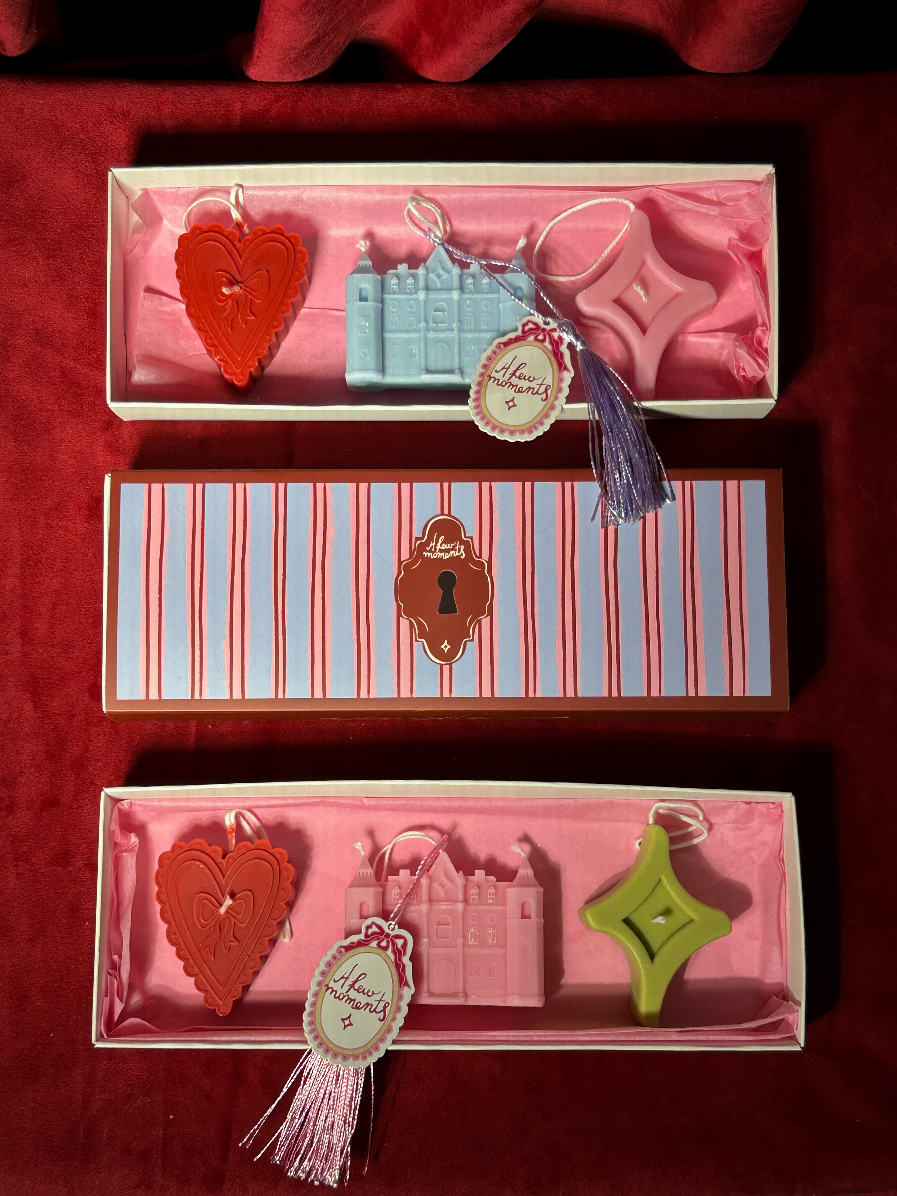 В нем три свечи-подвеса: Дом - уют, звезда - самовыражение, сердце - любовь. Это все элементы, которые живут в нашей вселенной и вдохновлены эстетикой фильмов Уэса Андерсона и иллюстрациями Люка Холла.