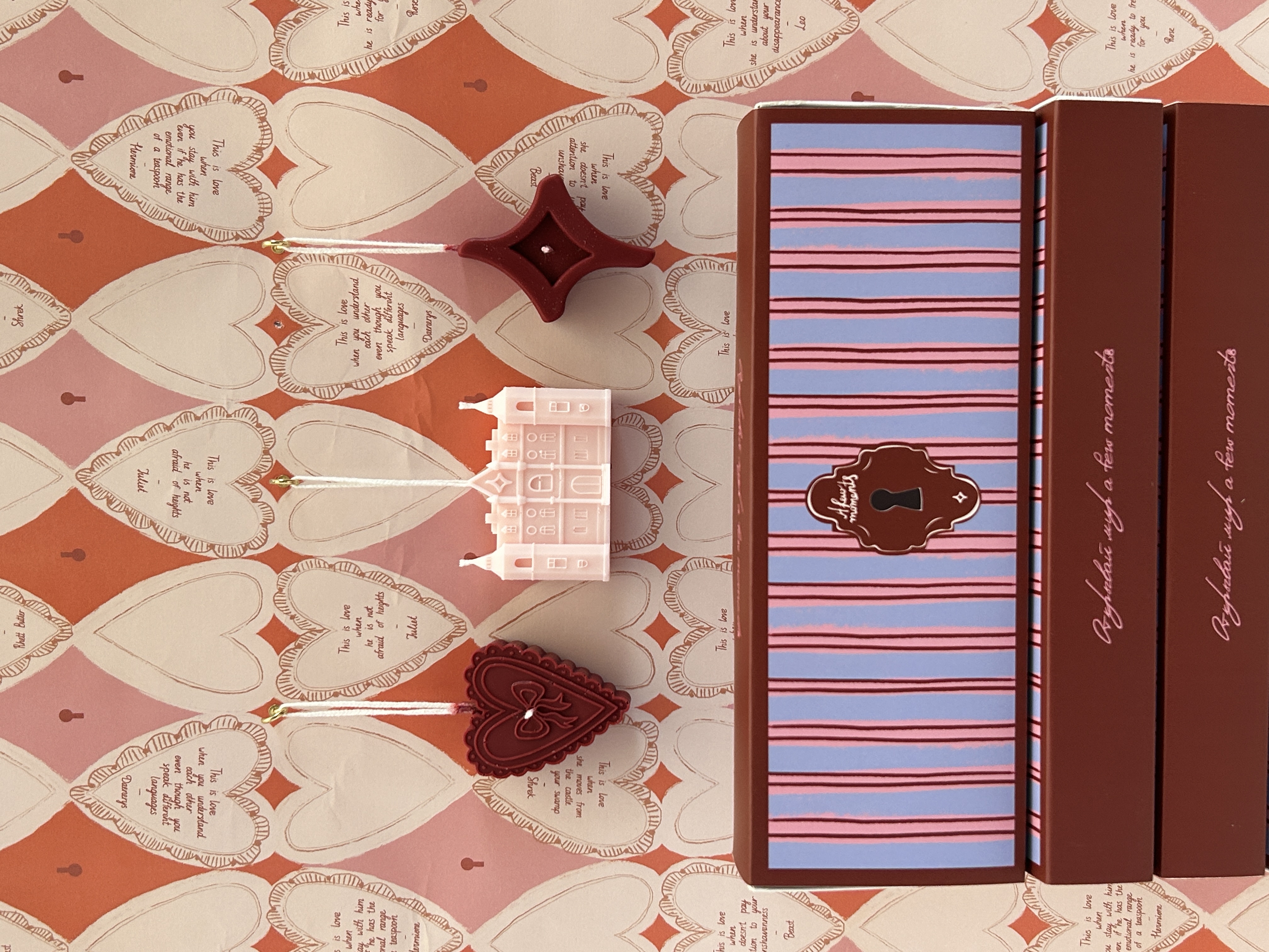 В нем три свечи-подвеса: Дом - уют, звезда - самовыражение, сердце - любовь. Это все элементы, которые живут в нашей вселенной и вдохновлены эстетикой фильмов Уэса Андерсона и иллюстрациями Люка Холла.