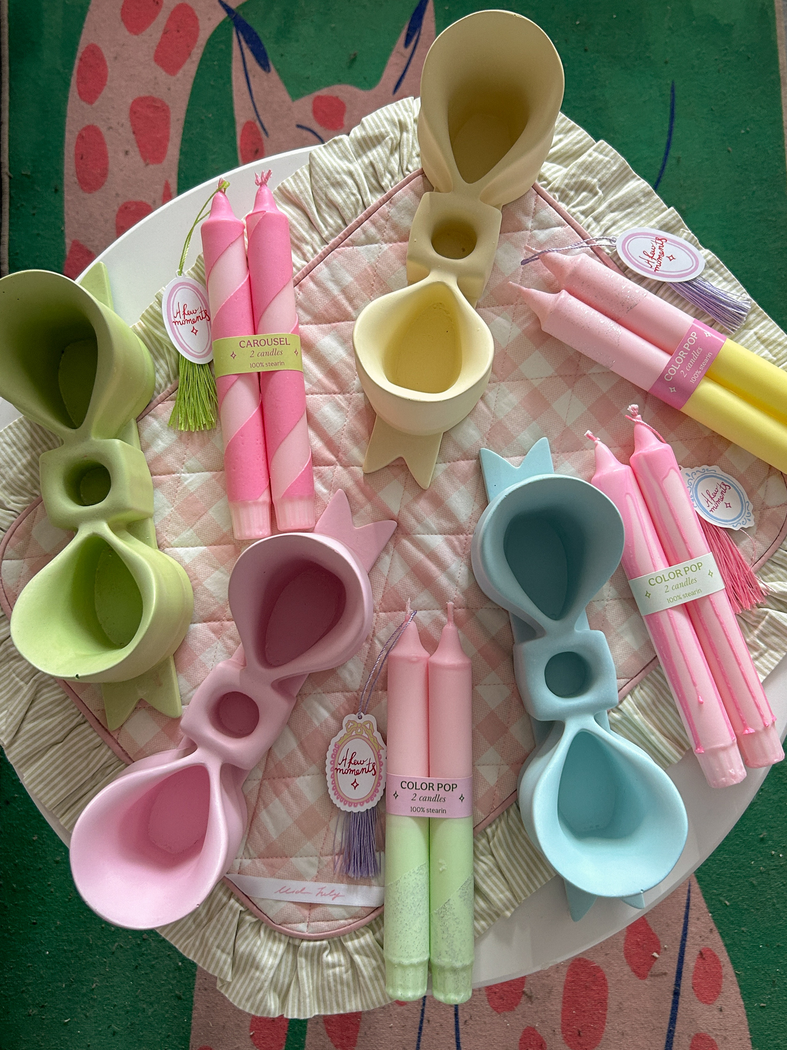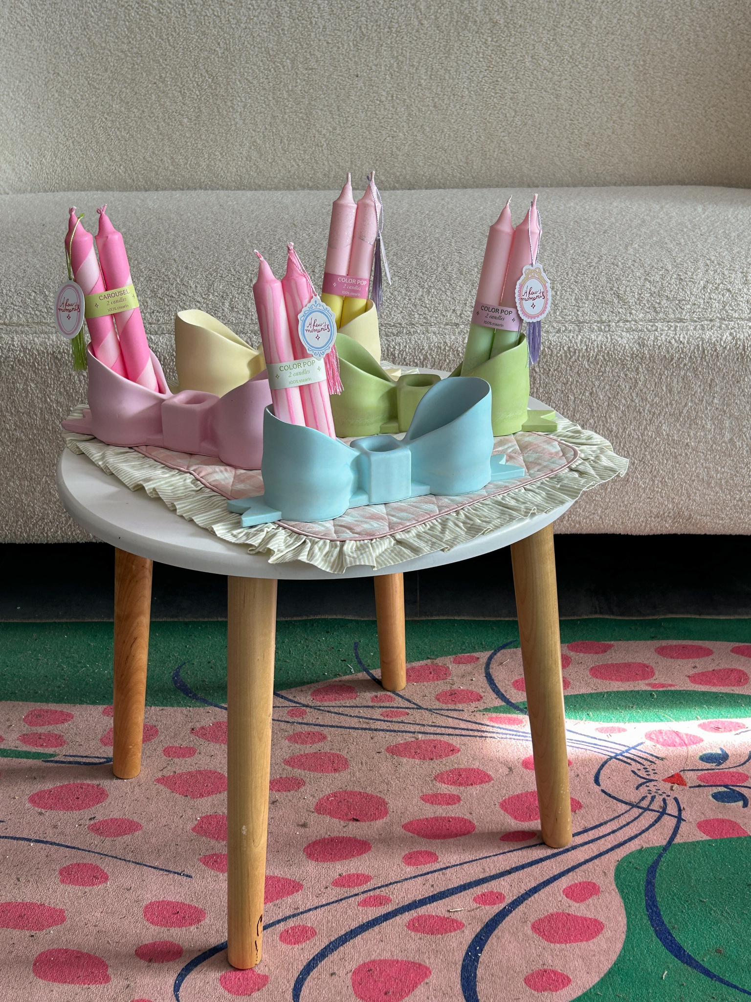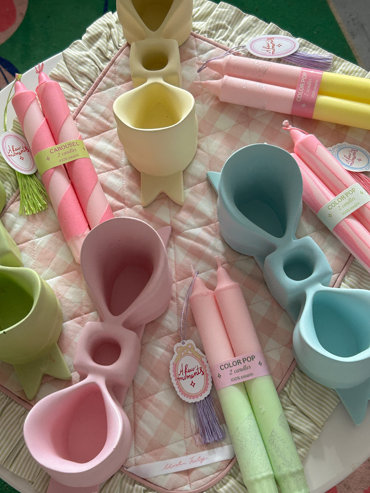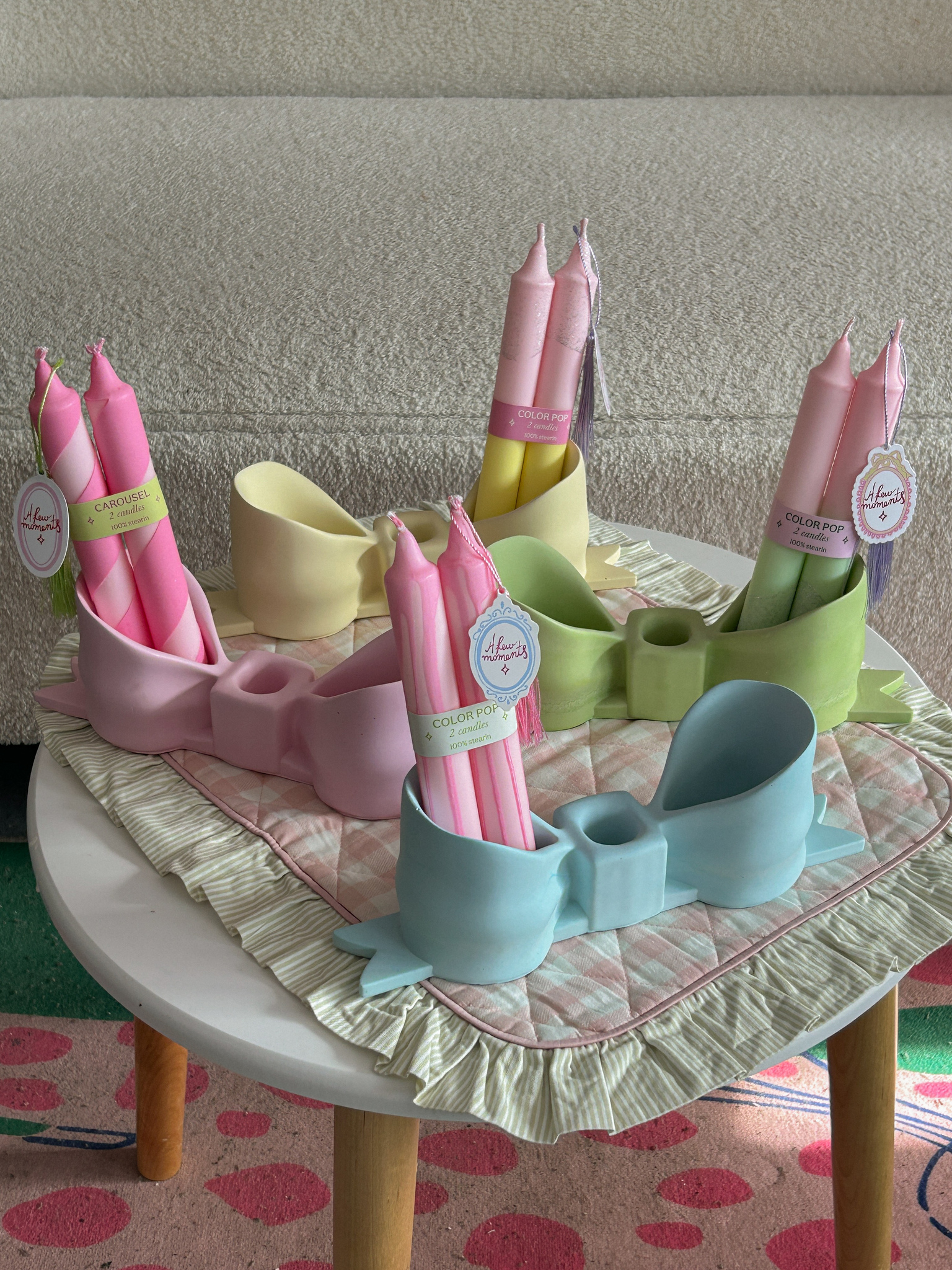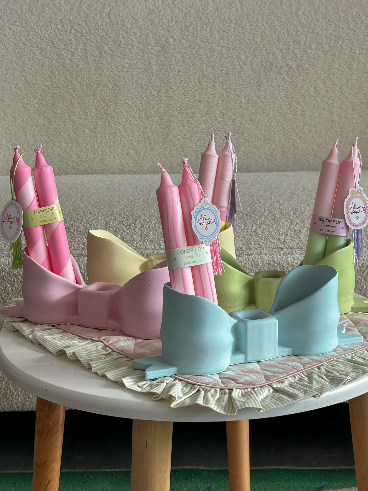 Вы можете выбрать цвет банта + любую пару из наших стеариновых свечей Color Pop, Color Pop Glitter, Carousel,