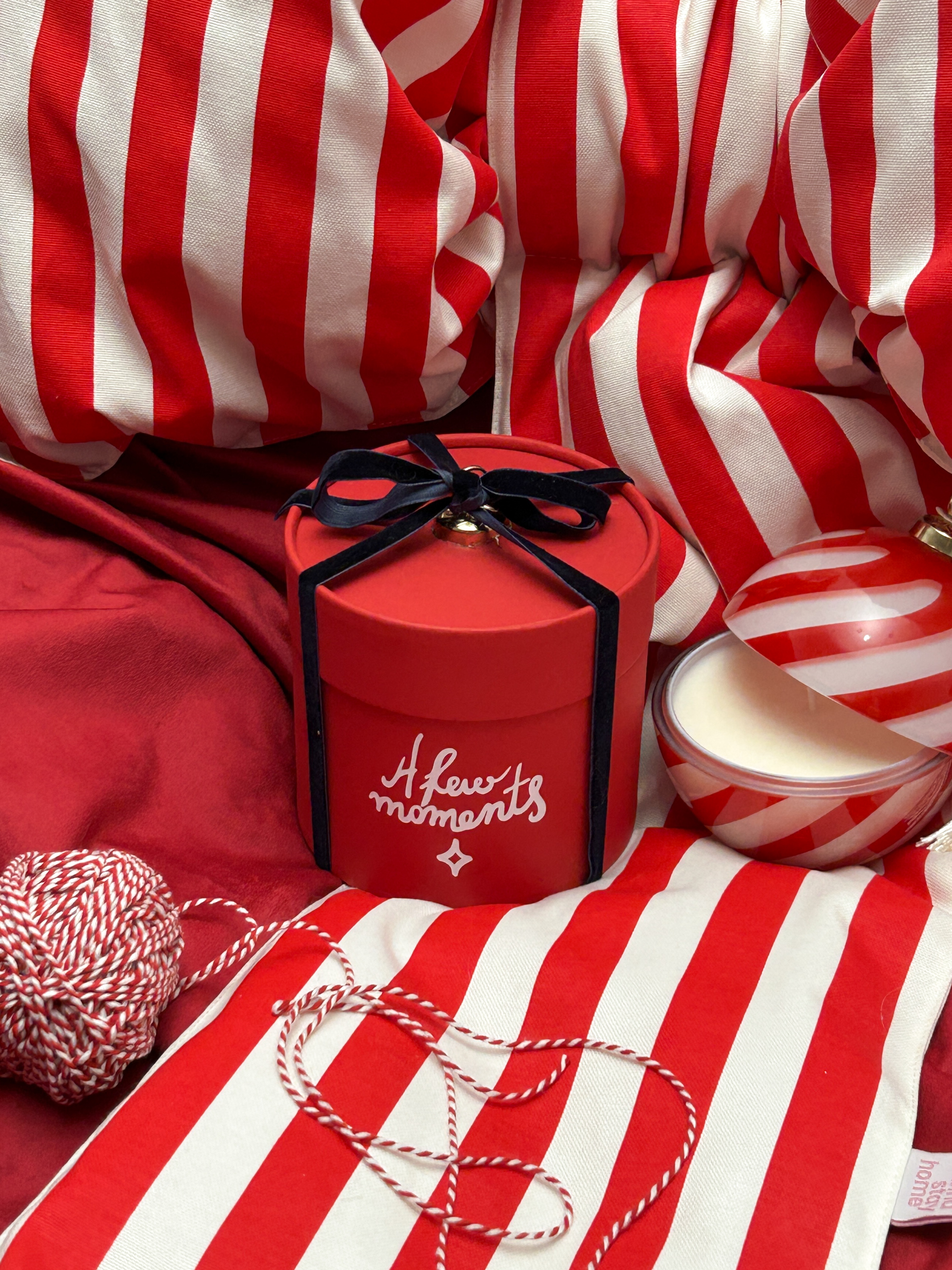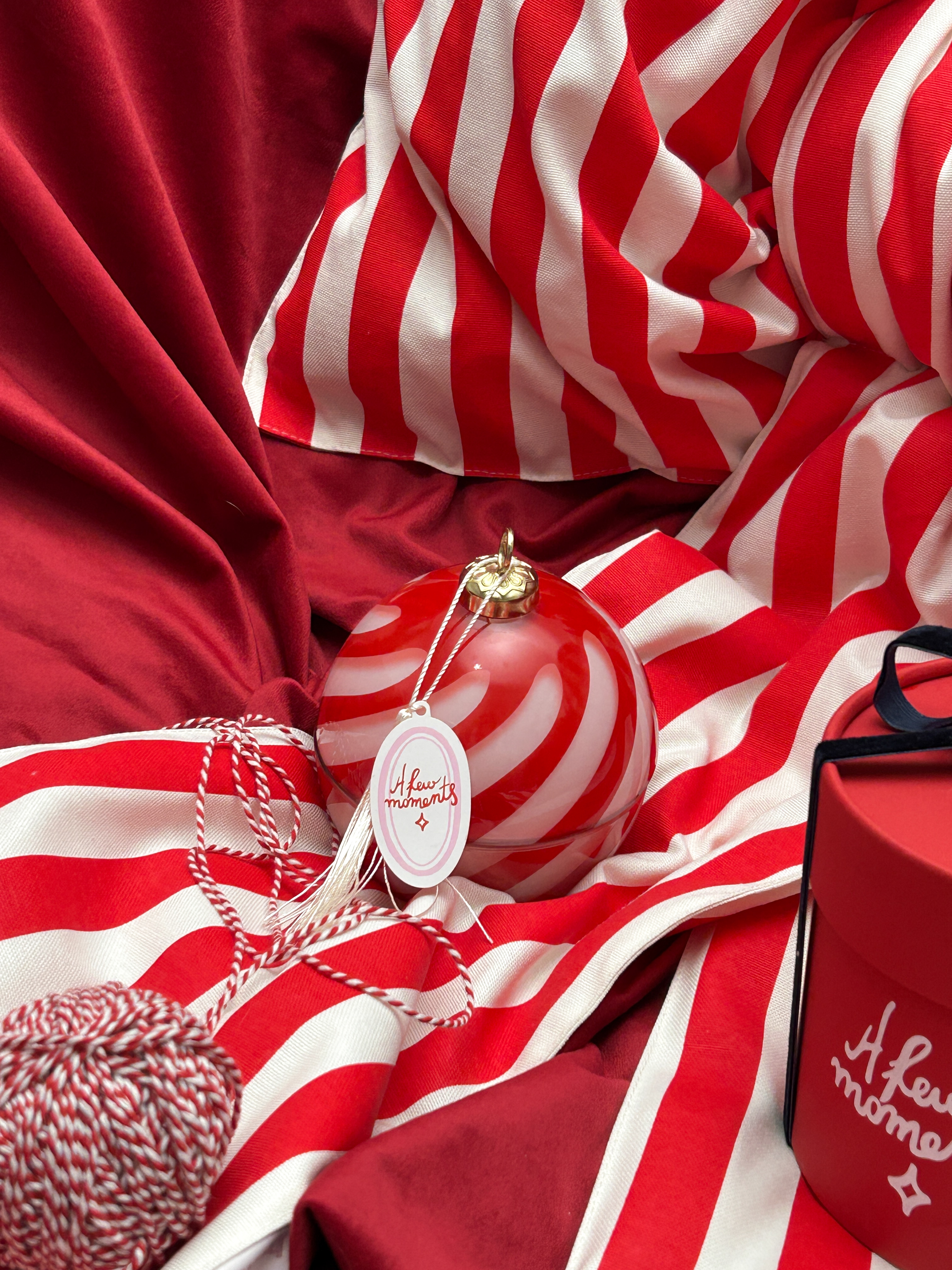 Упаковка шара - шляпная коробка с отверстием для крепления, с бархатистыми лентами.