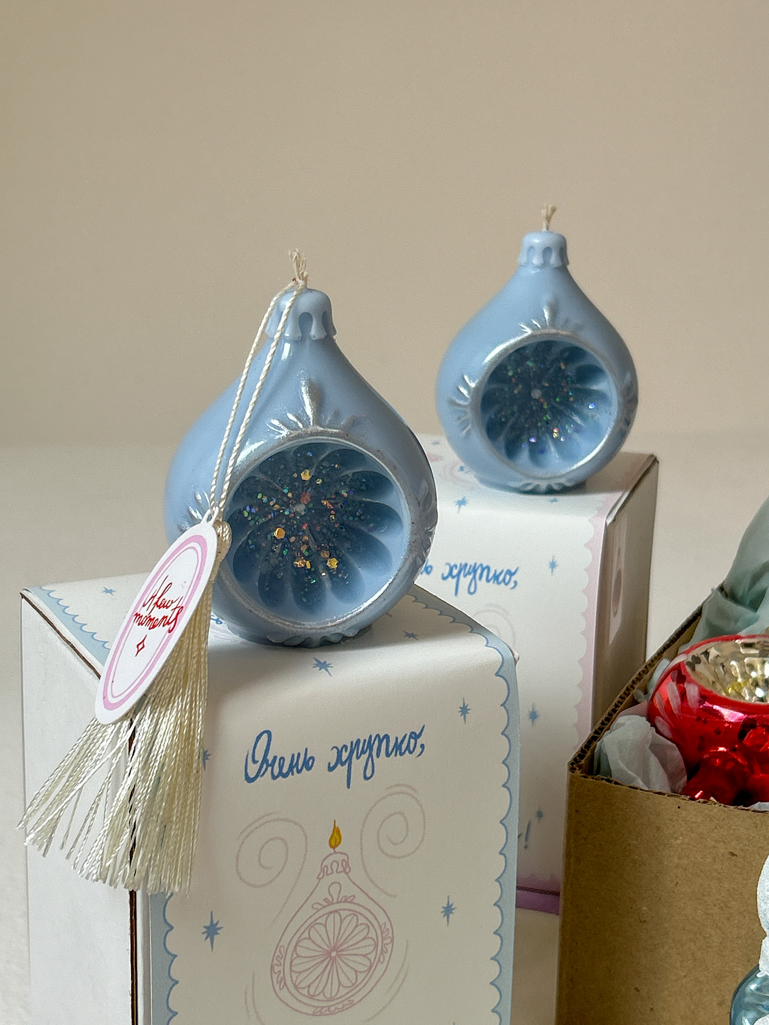 Упаковка шаров праздничная - белые, как снежки коробки с шубером "Очень хрупко и невероятно красиво", внутри прокладываем все имитацией "ваты", вкладываем открытку с пожеланием, спички. Свеча станет идеальным подарком :)