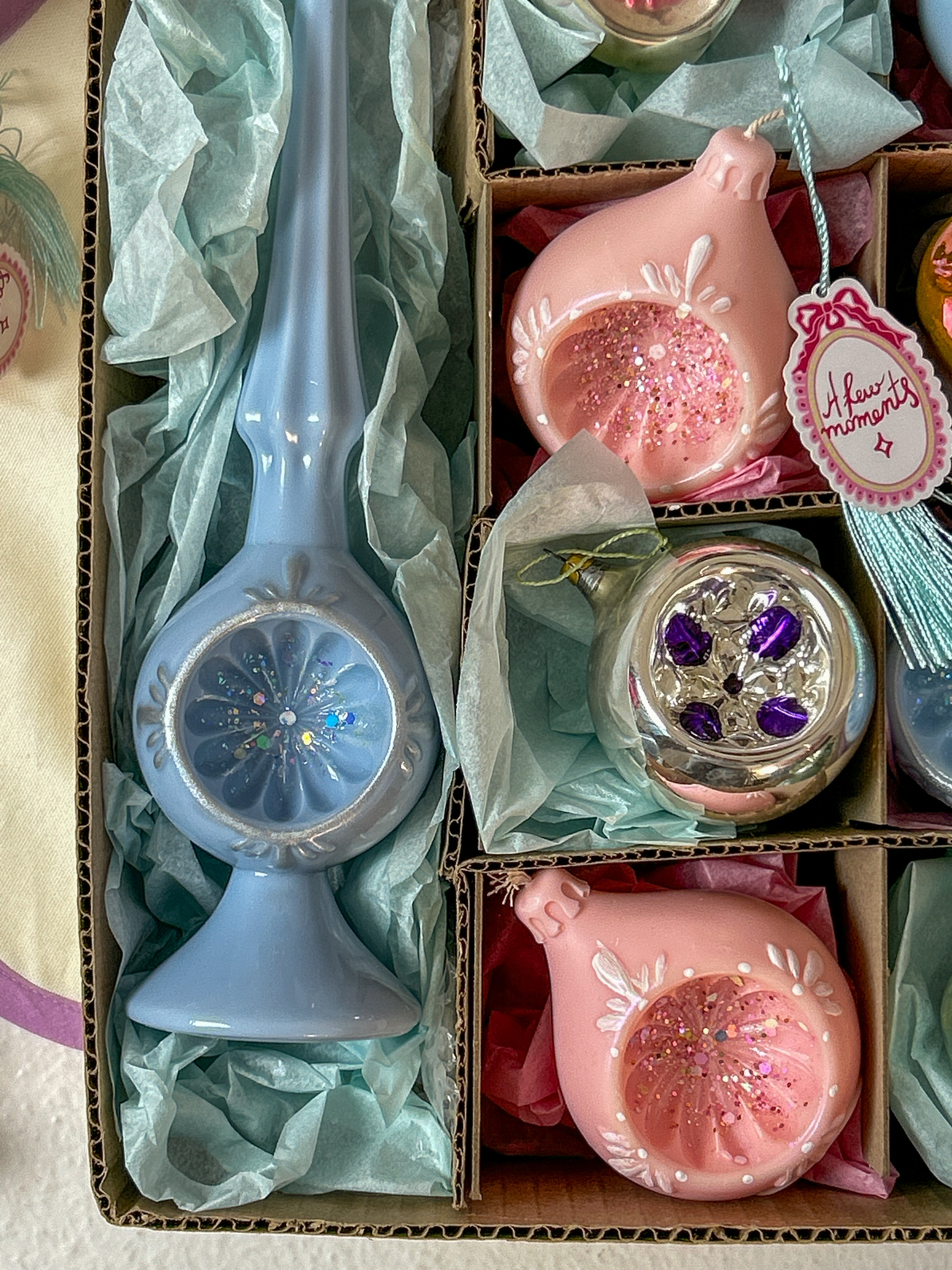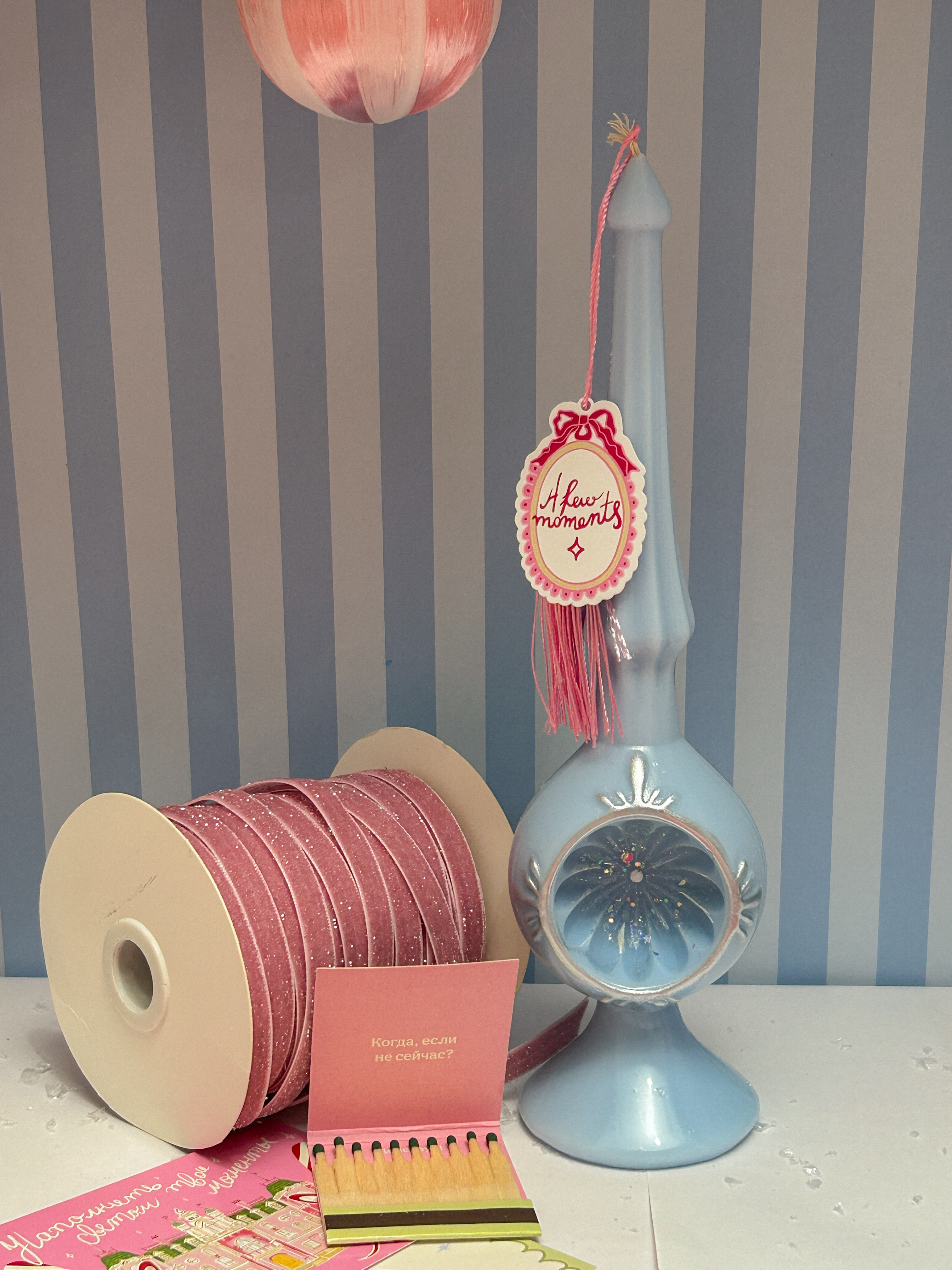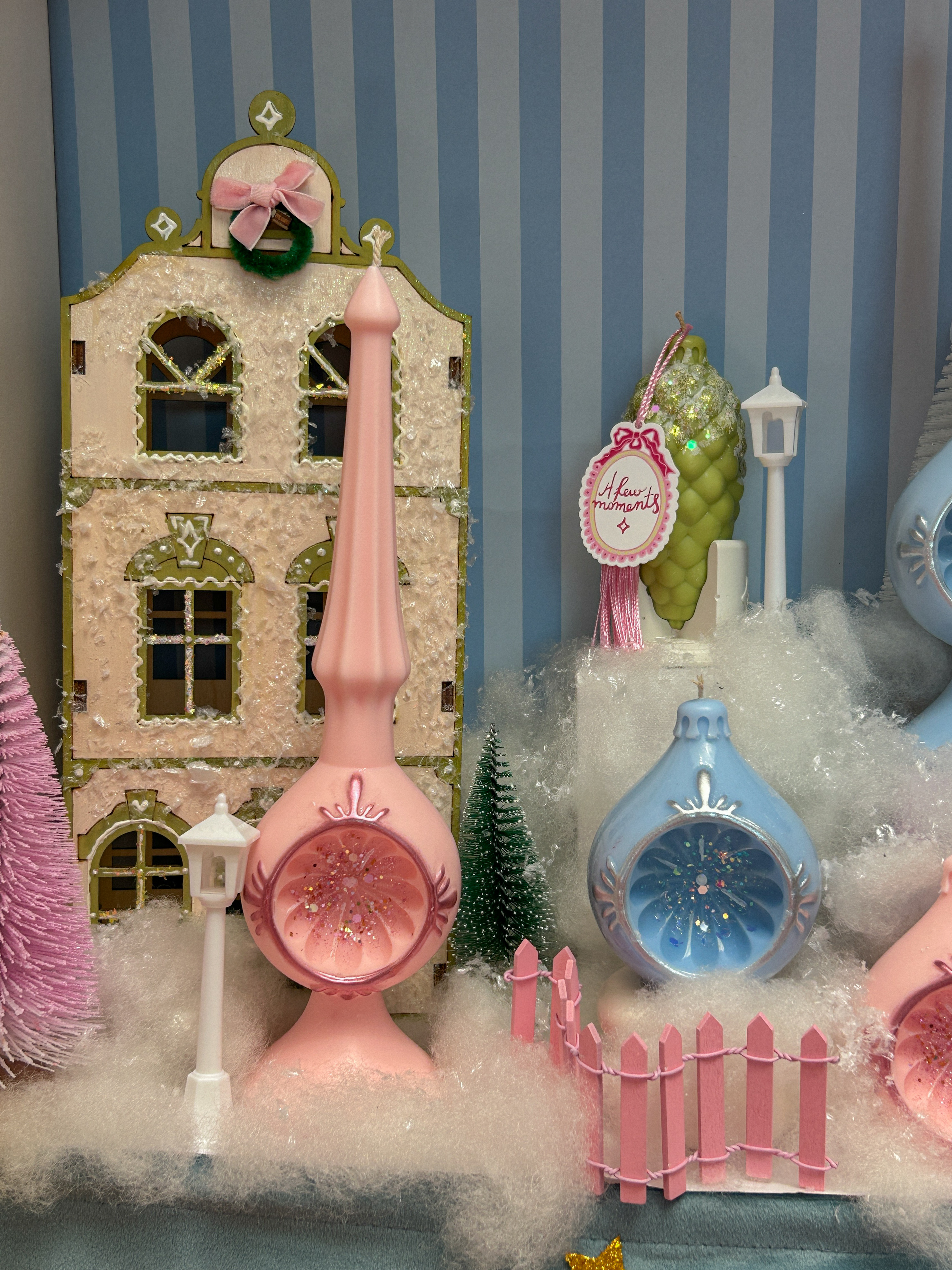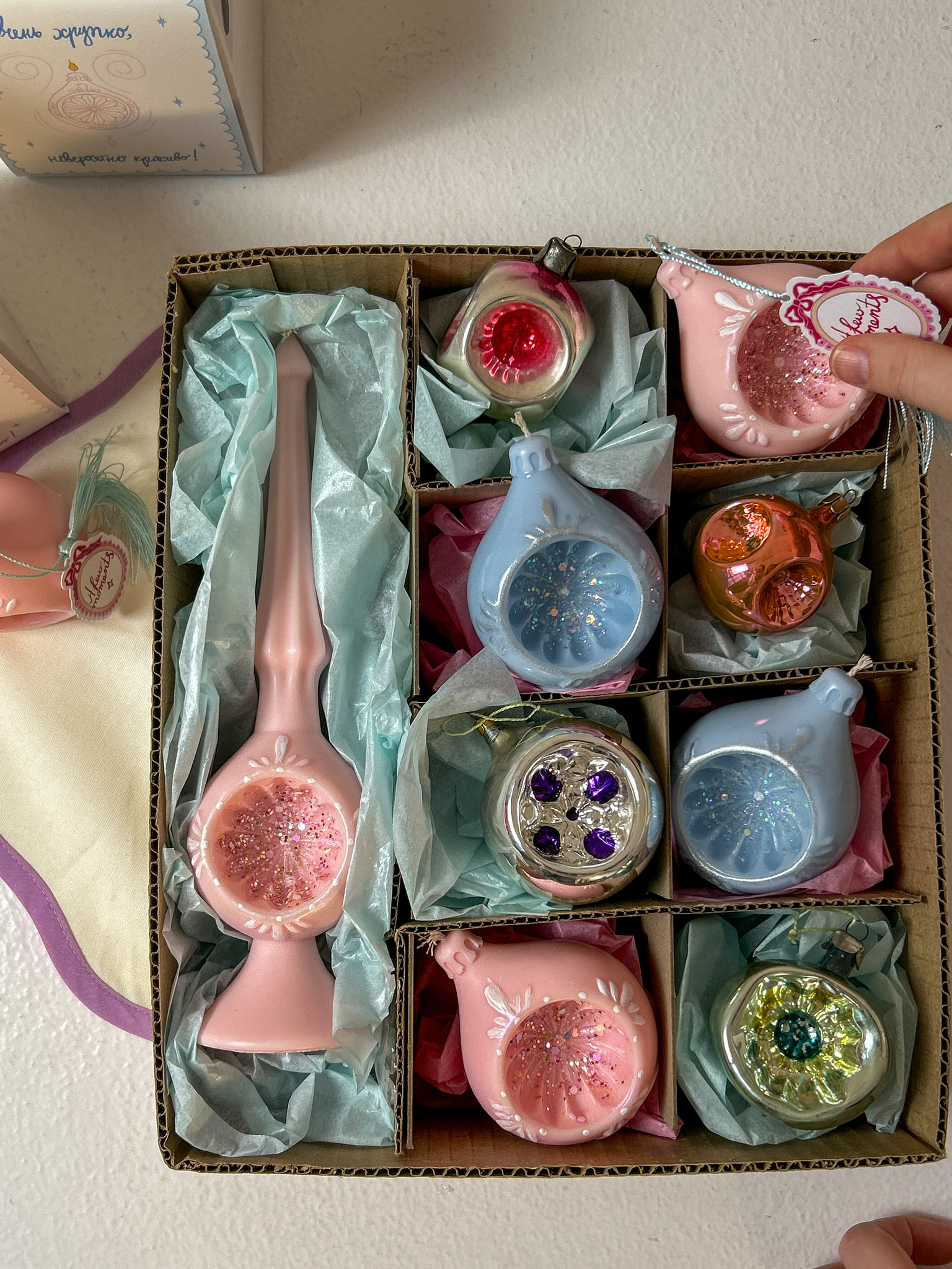 Упаковка шпилей праздничная - белые, как снежки коробки с шубером "Очень хрупко и невероятно красиво", внутри прокладываем все имитацией "ваты", вкладываем открытку с пожеланием, спички. Свеча станет идеальным подарком :)